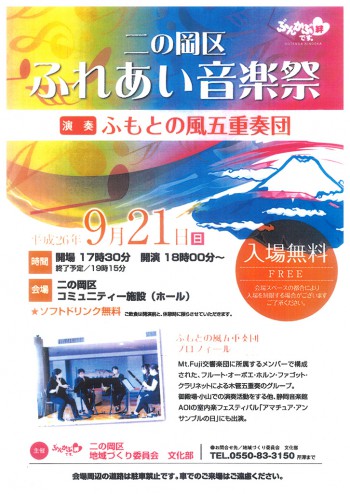 2014夏の地域音楽文化推進活動の報告 Posted on 2014年10月9日2022年4月7日 by M響 平成26年8月26日に町屋、平成26年9月21日に二の岡でM響団員による地域の皆さんと音楽交流をするコンサートを開催いたしました。 今回は木管五重奏「ふもとの風 五重奏団」の音色を楽しんでいただきました。演奏会では区民の皆様の歌声と笑顔で会場が湧き、清々しい夏の「ふれあいコンサート」となりました。